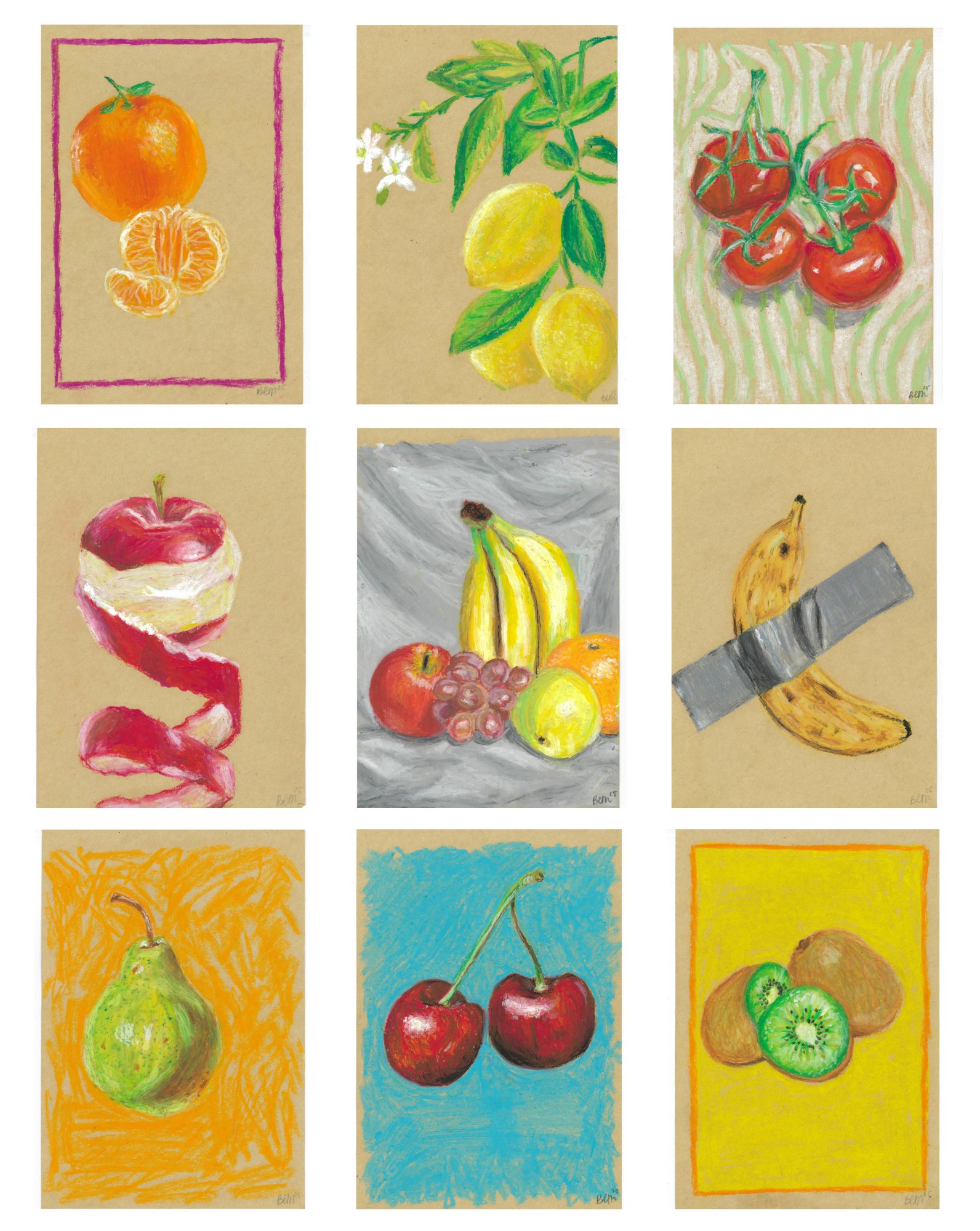 A5 drawings of fruit using oil pastels, either available as originals or A5 prints (250gsm)